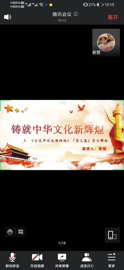 本次宣讲会的主题为“铸就中华文化新辉煌”。张瑞书记首先带领员工回顾了习近平总书记在党的十九大报告中和在甘肃考察调研期间发表的讲话,强调了弘扬中华传统文化的重要性。接着,他以习近平总书记高度重视中华优秀传统文化,并将其作为治国理政的重要思想文化资源为根基,讲述了党的十八大以来党中央从国家战略资源的高度继承优秀传统文化,引导传统文化与新兴科技相结合创新型发展文化产业,积极拓宽文明交流互鉴的途径,铸就了中华文化的新辉煌。最后,他指出:我们今天坚持的中国特色社会主义道路自信、理论自信、制度自信,其本质是坚持文化自信。身为新时代青年的我们应切实肩负起新的文化使命,为实现中华民族伟大复兴凝聚磅礴精神力量。