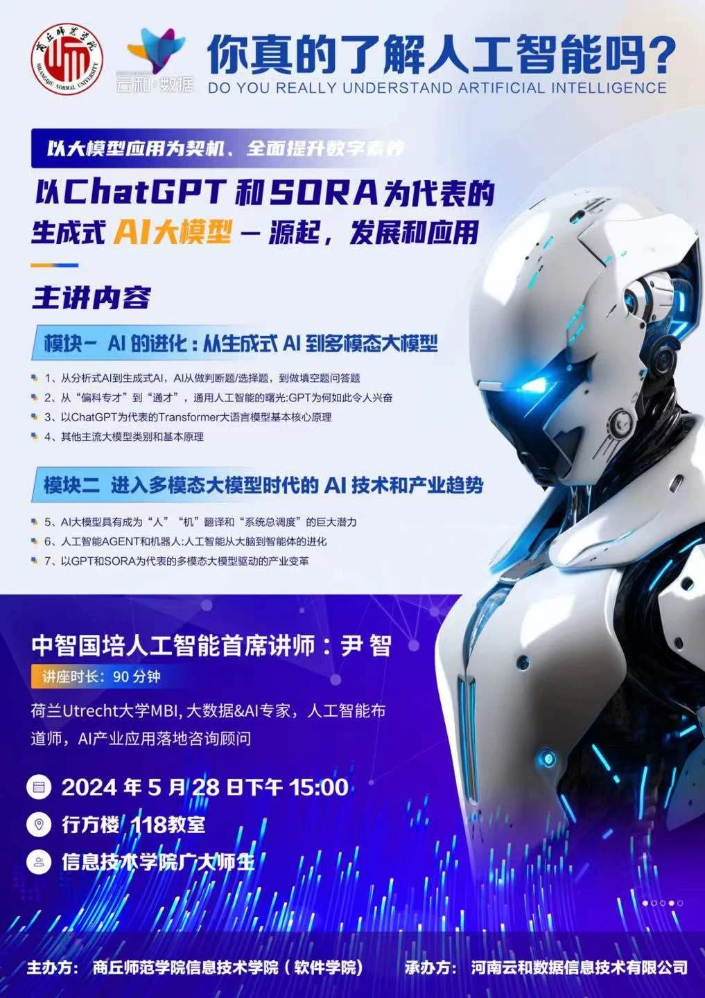 在这个快速变化的时代,掌握多元化的技能已成为个人发展和职场竞争的关键。为了响应时代需求,提升大家的综合竞争力,BB贝博艾弗森特此聘请中智国培人工智能首席讲师尹智为大家带来《以ChatGPT和SORA为代表的生成式AI大模型:源起,发展和应用》为主题的讲座。