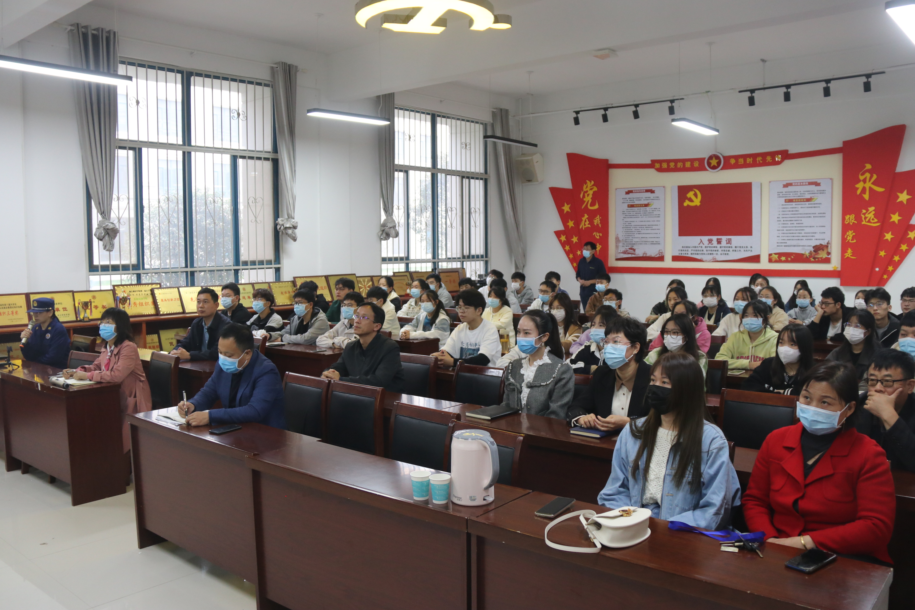 朱教官围绕“预防为主,防消结合”的原则,分别从校园防火、用火知识,灭火器的使用方法,宿舍及教室等不同火灾场景如何正确开展安全疏散与逃生的知识等内容向同学们进行深入浅出的讲解。