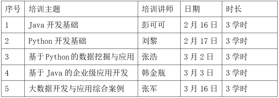 本次培训围绕Python与Java两种开发语言在大数据行业案例中的开发应用进行系统讲授。真正做到理论与实践相结合,激发员工学习兴趣、传授员工行业热门技术。
