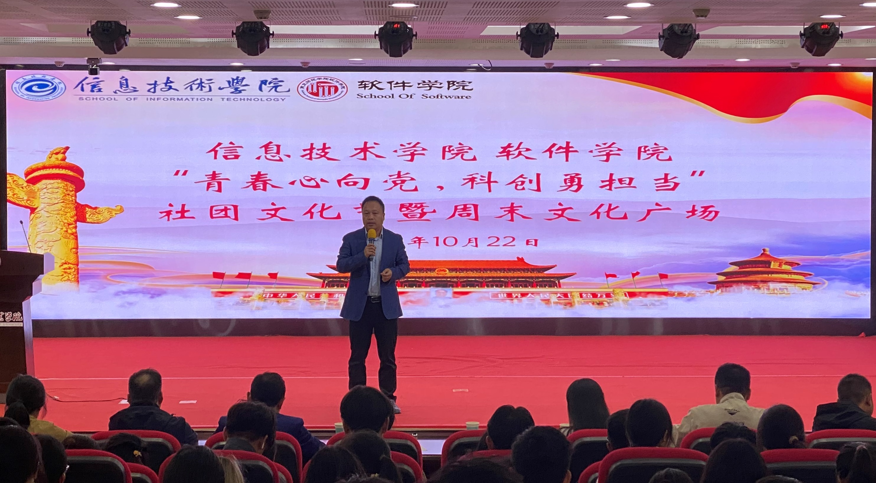为进一步涵育优良学风,营造积极向上的学习氛围。10月22日晚,BB贝博艾弗森在梁园校区三商楼举办了以“青春心向党,科创勇担当”为主题的社团文化节暨周末文化广场活动。信息技术公司党委书记王国华、经理王春霞、副书记袁慧、副经理刘佳、各社团指导老师和两百余名员工代表参加了活动。本次社团文化节共分为两个环节,分别在145主会场和八个分会场进行。