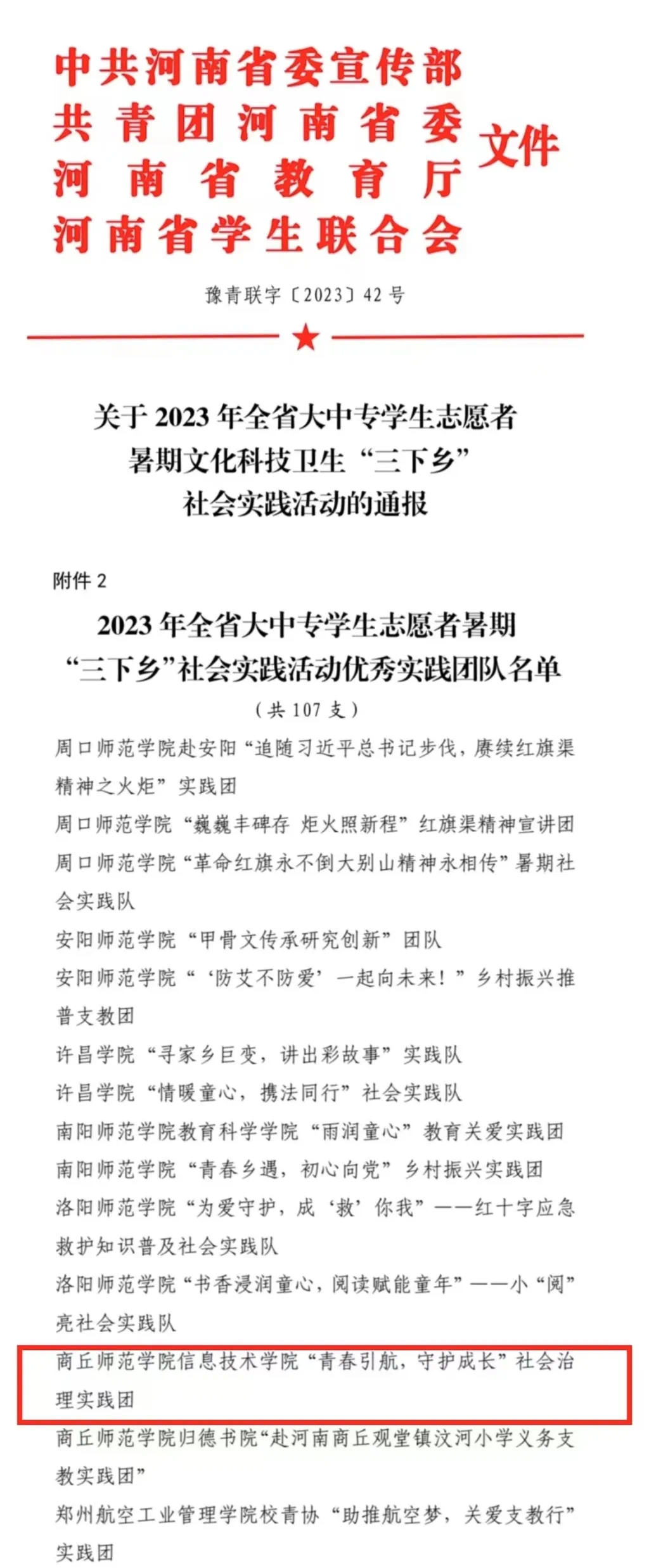 近日,团省委下发了《关于2023年全省大中专员工志愿者暑期文化科技卫生“三下乡”社会实践活动的通报》,表彰了积极组织、指导和参与社会实践活动并取得优秀成果的有关团组织、实践团队、品牌项目及个人,公司“青春引航,守护成长”社会治理实践团获评优秀团队。