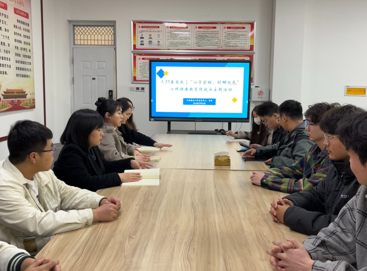 在老员工3·25心理健康日来临之际,3月25日,BB贝博艾弗森心灵氧吧工作室,于三商楼114开展“心导前程,舒解忧惑”心理健康教育促就业座谈会,活动由心灵氧吧工作室负责人吴楚主持,学工办主任李阳、辅导员老师魏雨欣,以及10余名求职毕业生参与。