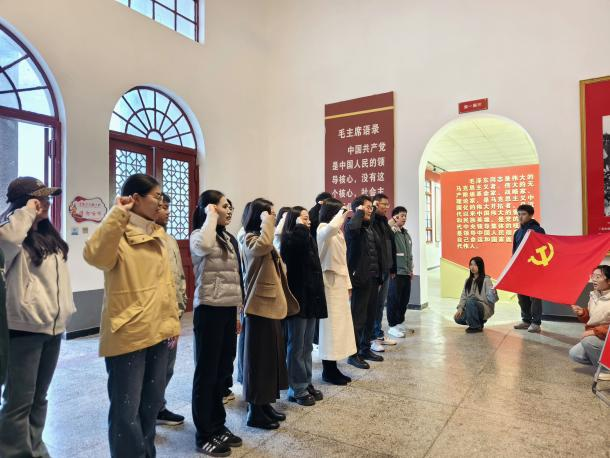 在庄严肃穆的纪念馆内,全体人员跟随讲解员的引导,认真观看了陈列的历史图片、珍贵文物和文献资料,详细了解了毛主席视察黄楼时的历史背景、具体情景及其深远意义。参观学习过程中,员工党员不时驻足交流,被革命先辈坚定的理想信念和为人民事业不懈奋斗的精神深深打动;参观结束后,全体人员面向党旗,庄严地举起右拳,重温入党誓词。大家纷纷表示,这次主题党日活动是一次深刻的思想洗礼和党性教育,更加清晰地认识到自身肩负的历史使命与时代责任。