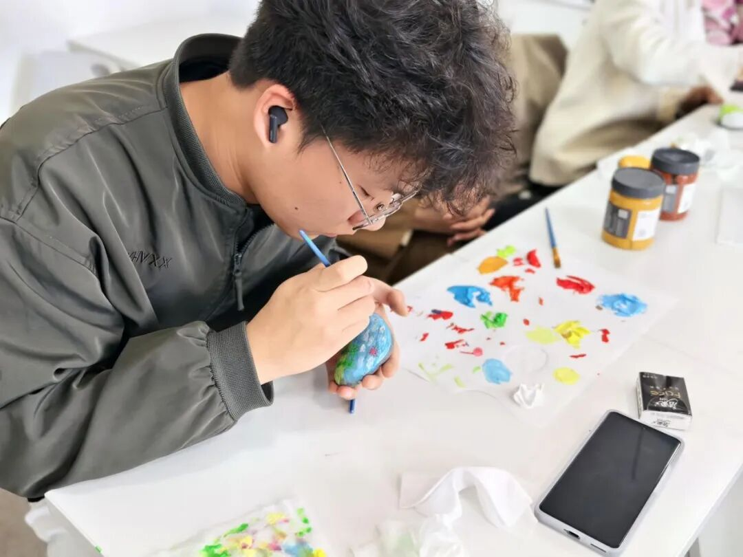 员工们手持彩石、颜料,将焦虑、喜悦、期待等抽象情绪转化为具象画面:有的用蓝色渐变勾勒学业压力,有的以暖黄线条传递生活希望。